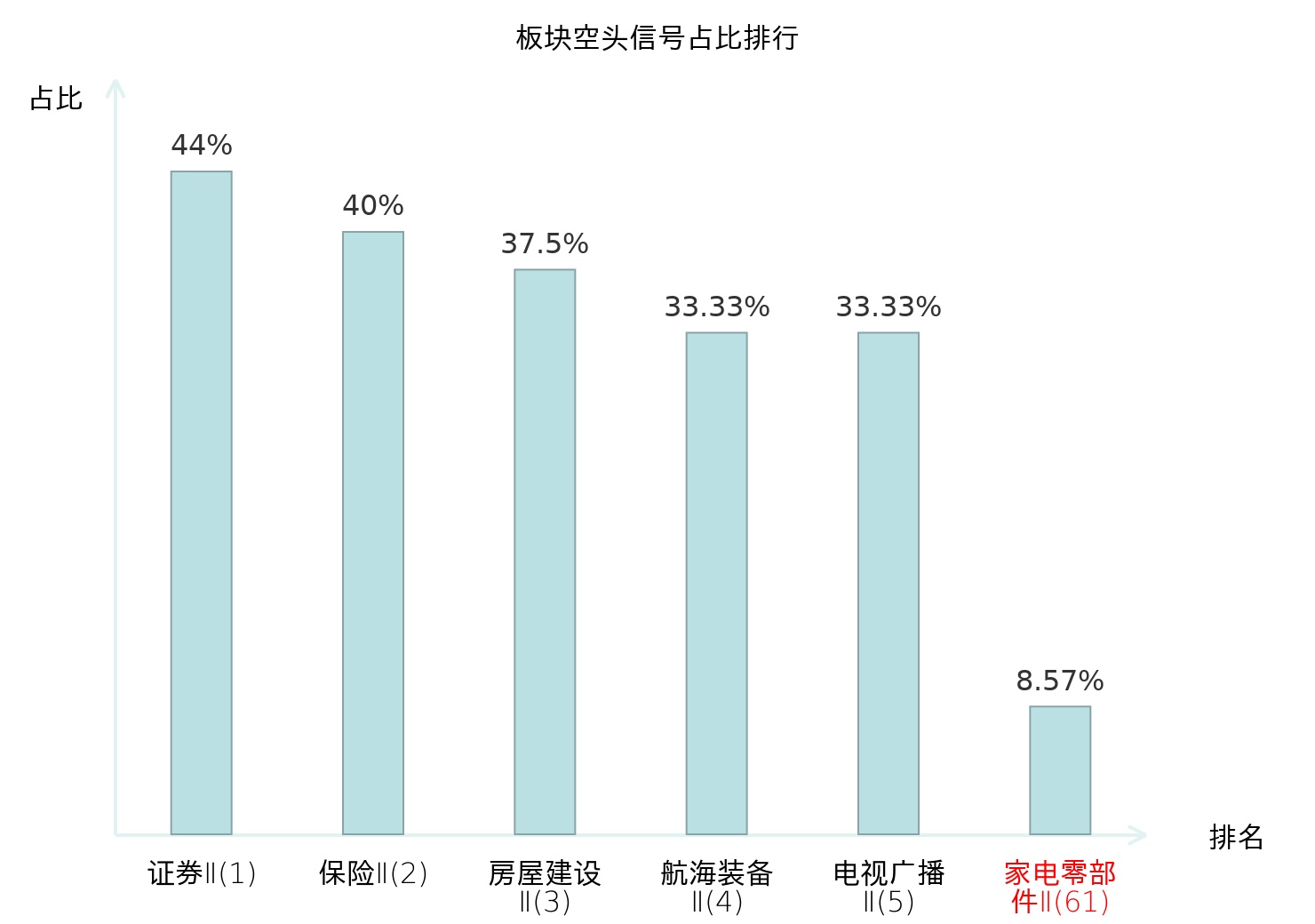 全市场所有行业板块中主力空头信号占比排名中,证券Ⅱ板块位居第一。证券Ⅱ板块名次提升最快,较昨日上升125位。