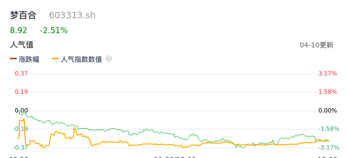 04月10日,梦百合收报8.92,股价涨幅-2.51%,成交金额3236.06万元,换手率0.74%。