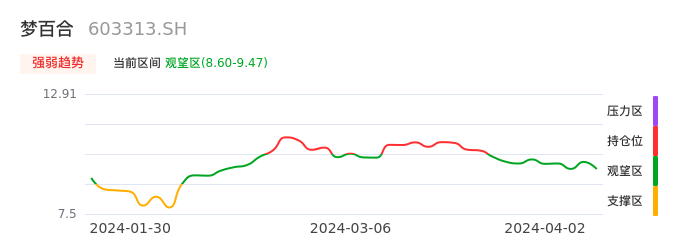 我们来看一下该股的九方特色指标强弱趋势的情况:梦百合自03月21日从持仓区下穿到观望区,股价近期持续走弱。短期已经进入空头行情,且下跌动能仍未衰竭。建议继续谨慎观望。