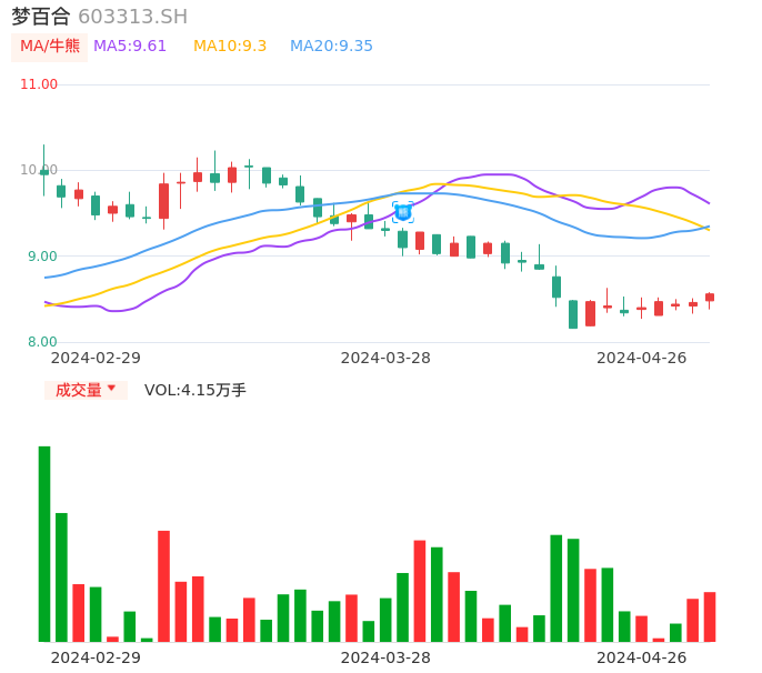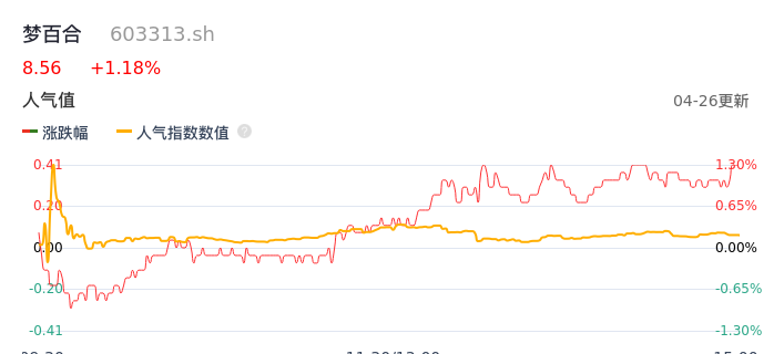 04月26日,梦百合收报8.56,股价涨幅1.18%,成交金额3532.53万元,换手率0.86%。