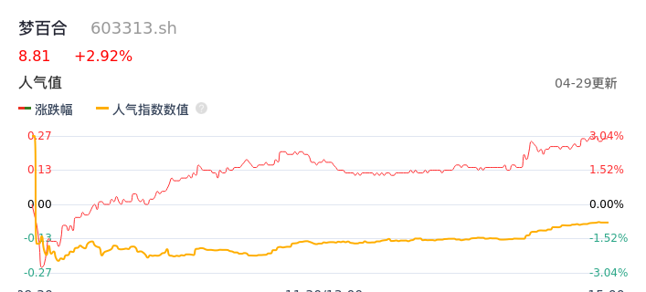 04月29日,梦百合收报8.81,股价涨幅2.92%,成交金额6498.89万元,换手率1.55%。