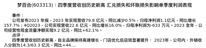 值得注意的是:2024年04月光大证券的姜浩分析师,首次发布关于梦百合的研究报告,标题为:梦百合(603313):四季度营收创历史新高 汇兑损失和坏账损失影响单季度利润表现。