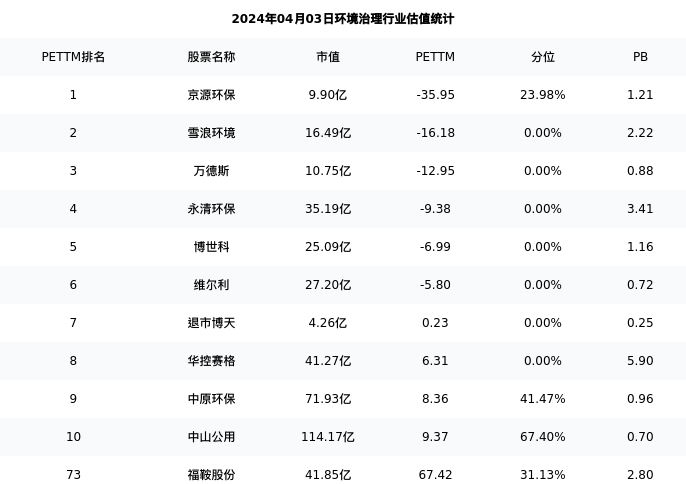 福鞍股份最新报告期数据为三季度,下表汇总了环境治理行业内市值靠前的公司三季度主要经营数据