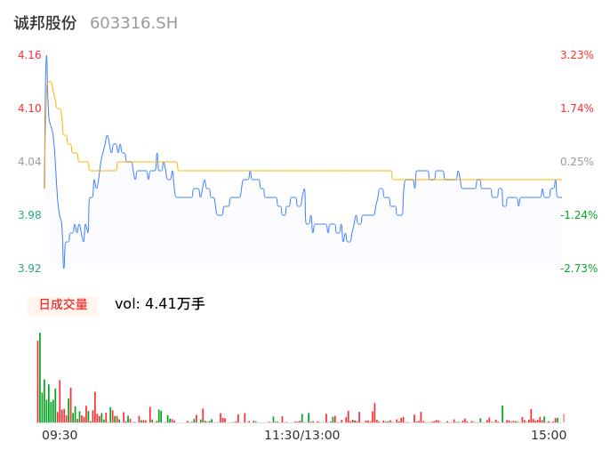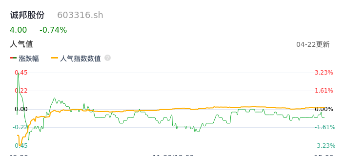 04月22日,诚邦股份收报4.00,股价涨幅-0.74%,成交金额1775.05万元,换手率1.67%。