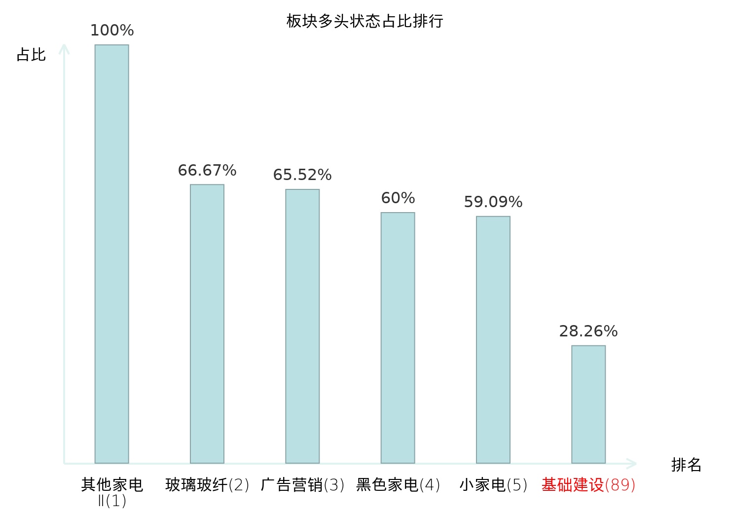 全市场所有行业板块中主力多头状态占比排名中,其他家电Ⅱ板块位居第一。航天装备Ⅱ板块名次提升最快,较昨日上升79位。