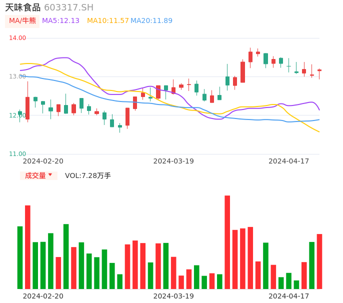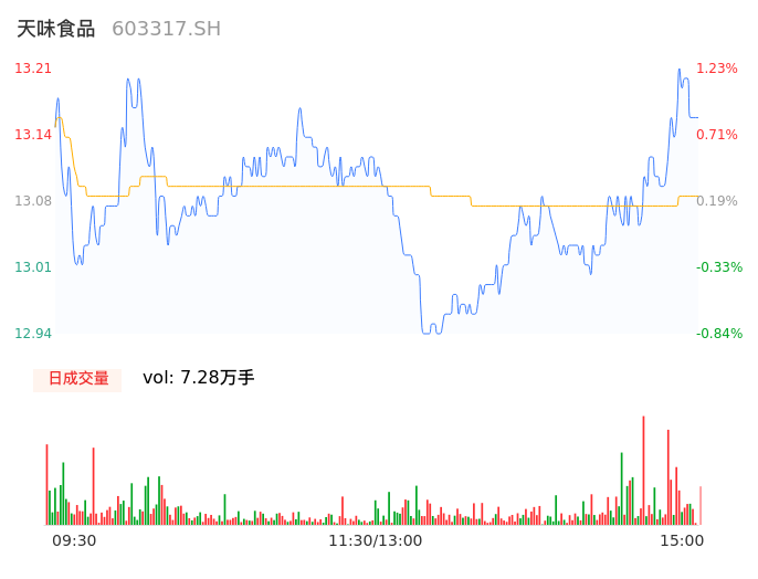 04月17日,天味食品收报13.18,股价涨幅1.00%,成交金额9527.20万元,换手率0.69%。