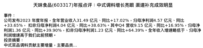 值得注意的是:2024年04月申港证券的徐广福分析师,首次发布关于天味食品的研究报告,标题为:天味食品(603317)年报点评:中式调料增长亮眼 渠道补充成效明显。