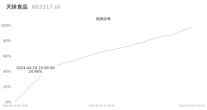 603317天味食品2024年04月24日成交5.13万手,成交金额6920.95万元,相较昨日放量4564手,换手率0.48%,成交清淡。