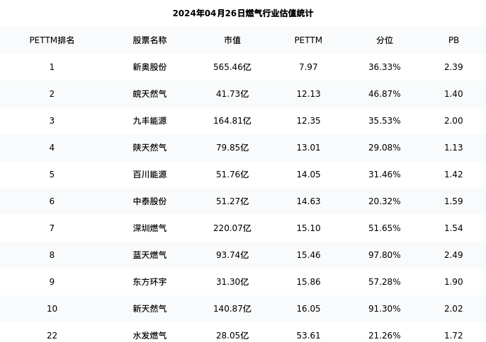 从估值角度看:水发燃气最新市盈率PETTM为53.61,在行业内排名22/29,处于21.26分位。