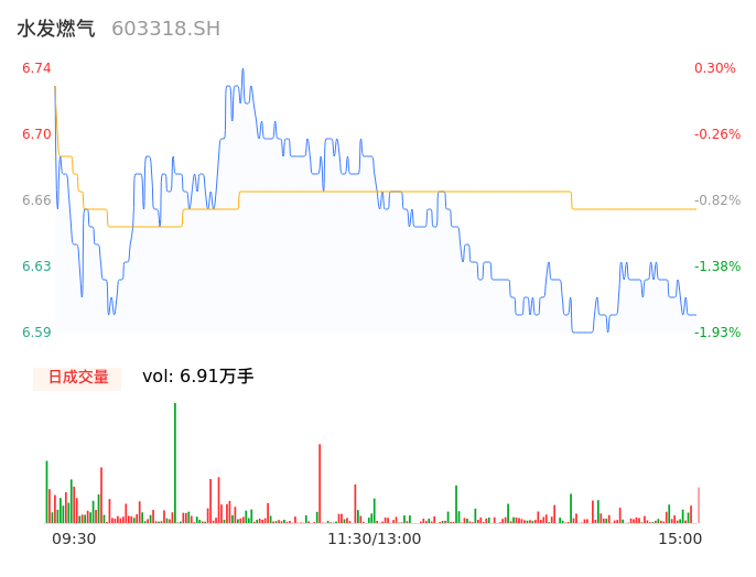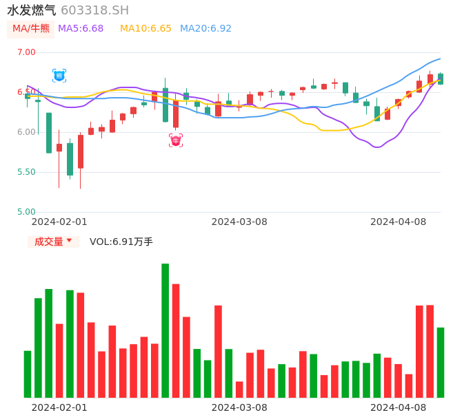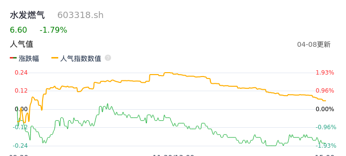 04月08日,水发燃气收报6.60,股价涨幅-1.79%,成交金额4596.43万元,换手率1.80%。