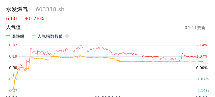 04月11日,水发燃气收报6.60,股价涨幅0.76%,成交金额4291.90万元,换手率1.69%。