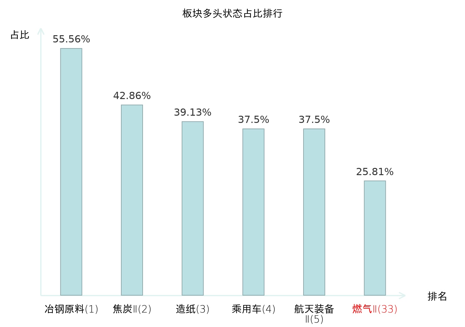 全市场所有行业板块中主力多头状态占比排名中,冶钢原料板块位居第一。房屋建设Ⅱ板块名次提升最快,较昨日上升84位。