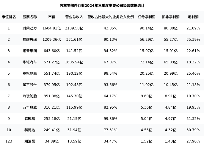 湘油泵最新报告期数据为三季度,下表汇总了汽车零部件行业内市值靠前的公司三季度主要经营数据