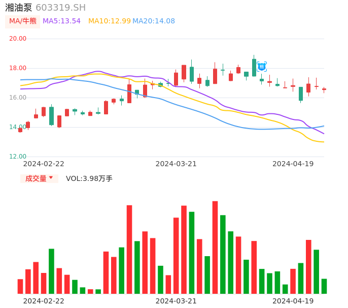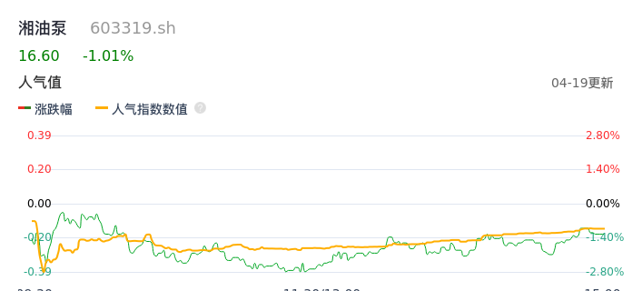 04月19日,湘油泵收报16.60,股价涨幅-1.01%,成交金额6561.73万元,换手率1.92%。
