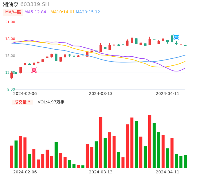 04月11日,湘油泵收报16.80,股价涨幅-1.75%,成交金额8414.76万元,换手率2.40%。