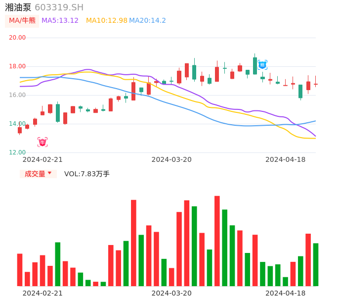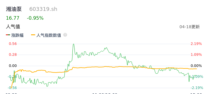 04月18日,湘油泵收报16.77,股价涨幅-0.95%,成交金额1.32亿元,换手率3.78%。