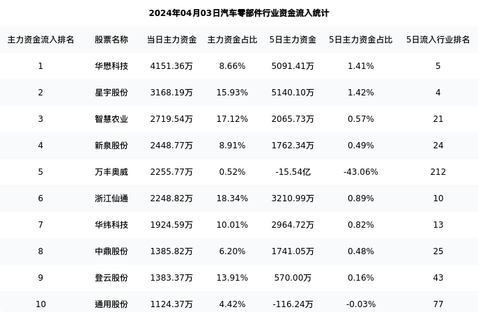 从主力资金流向来看,汽车零部件行业今日主力资金流入83.48亿元,在所有申万二级行业中排名:4/131。