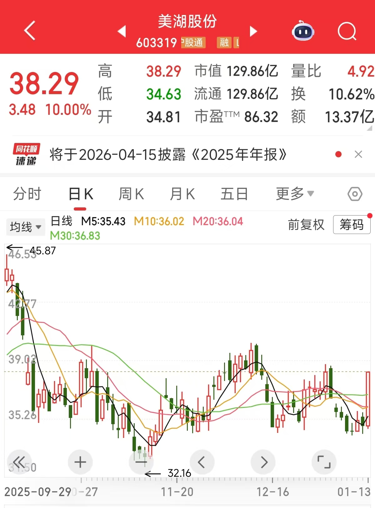 上证报中国证券网讯截至1月13日午间收盘,美湖股份涨停,报38.29元/股。
