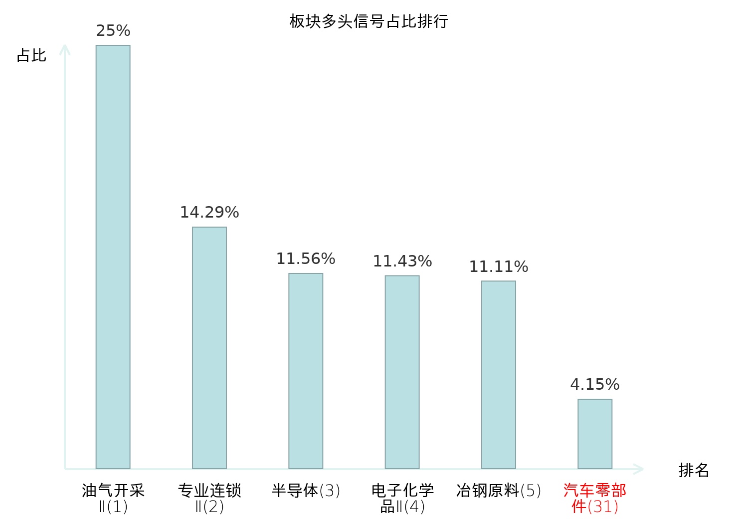 全市场所有行业板块中主力多头信号占比排名中,油气开采Ⅱ板块位居第一。油气开采Ⅱ板块名次提升最快,较昨日上升127位。
