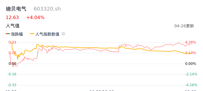 04月26日,迪贝电气收报12.63,股价涨幅4.04%,成交金额8054.93万元,换手率4.97%。