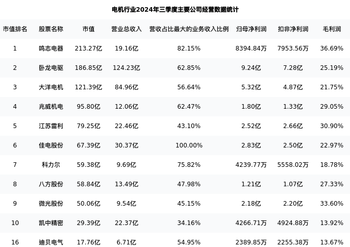迪贝电气最新报告期数据为三季度,下表汇总了电机行业内市值靠前的公司三季度主要经营数据