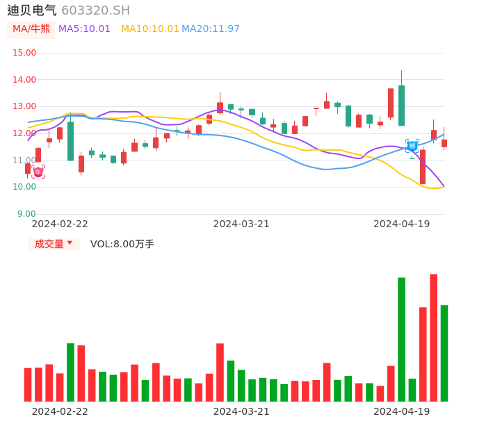 迪贝电气近期出现日线级别熊点,且60分钟级别也处于熊点区间,股价处于偏弱行情,建议谨慎观望。