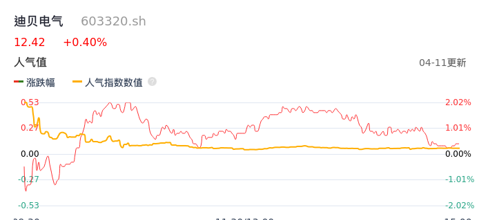 04月11日,迪贝电气收报12.42,股价涨幅0.40%,成交金额1617.59万元,换手率1.00%。