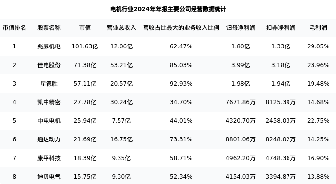 迪贝电气最新报告期数据为年报,下表汇总了电机行业内市值靠前的公司年报主要经营数据