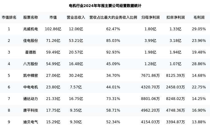迪贝电气最新报告期数据为年报,下表汇总了电机行业内市值靠前的公司年报主要经营数据