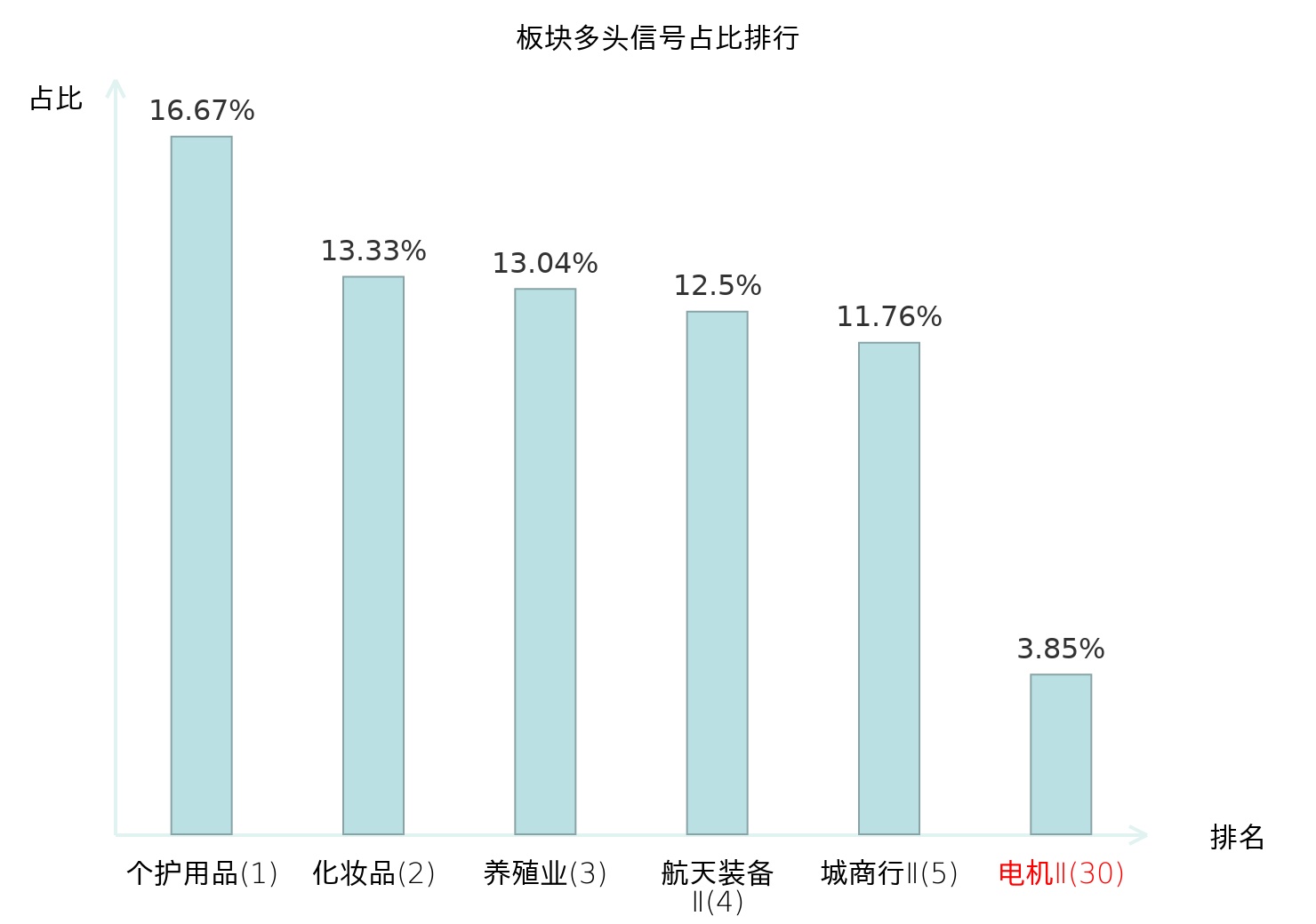 全市场所有行业板块中主力多头信号占比排名中,个护用品板块位居第一。航天装备Ⅱ板块名次提升最快,较昨日上升118位。
