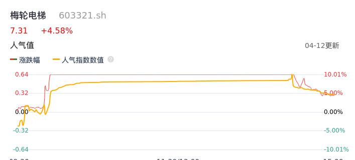 04月12日,梅轮电梯收报7.31,股价涨幅4.58%,成交金额1.05亿元,换手率4.55%。