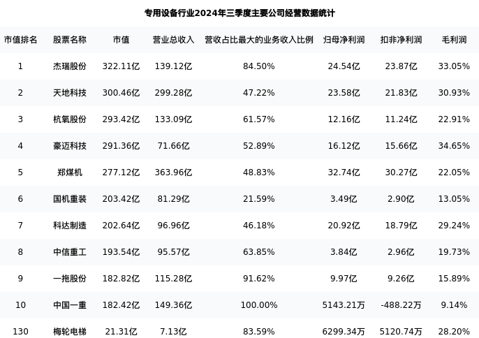 梅轮电梯最新报告期数据为三季度,下表汇总了专用设备行业内市值靠前的公司三季度主要经营数据