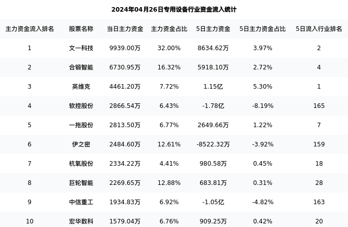 从主力资金流向来看,专用设备行业今日主力资金流入45.56亿元,在所有申万二级行业中排名:87/131。