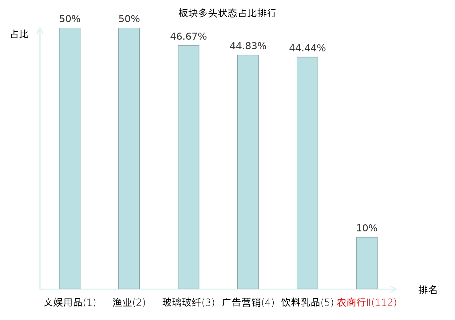 全市场所有行业板块中主力多头状态占比排名中,文娱用品板块位居第一。饮料乳品板块名次提升最快,较昨日上升59位。