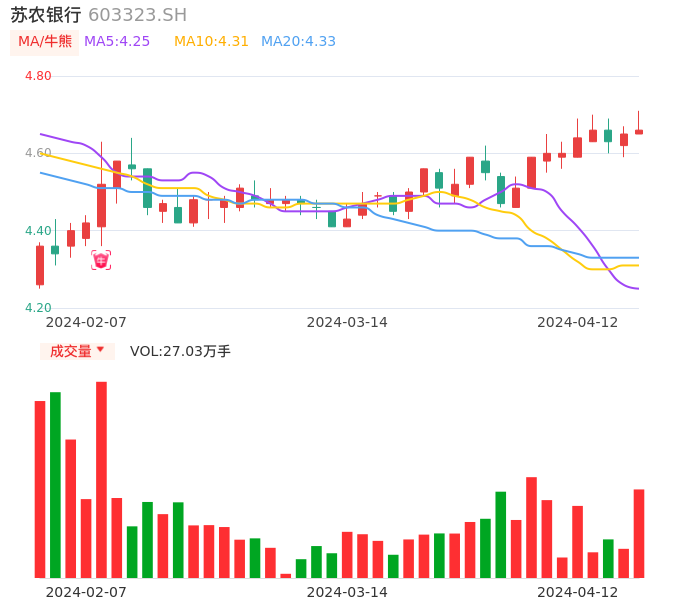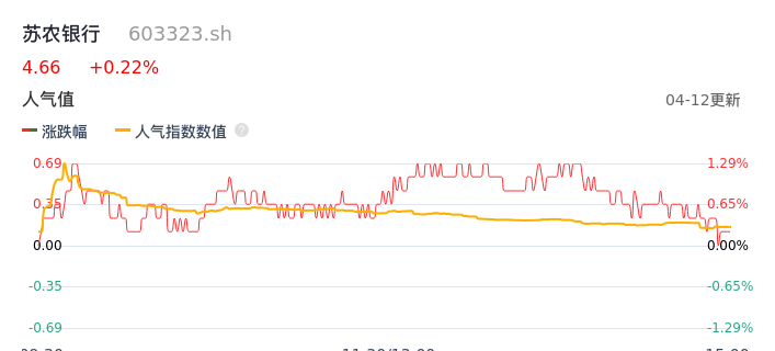 04月12日,苏农银行收报4.66,股价涨幅0.22%,成交金额1.27亿元,换手率1.75%。