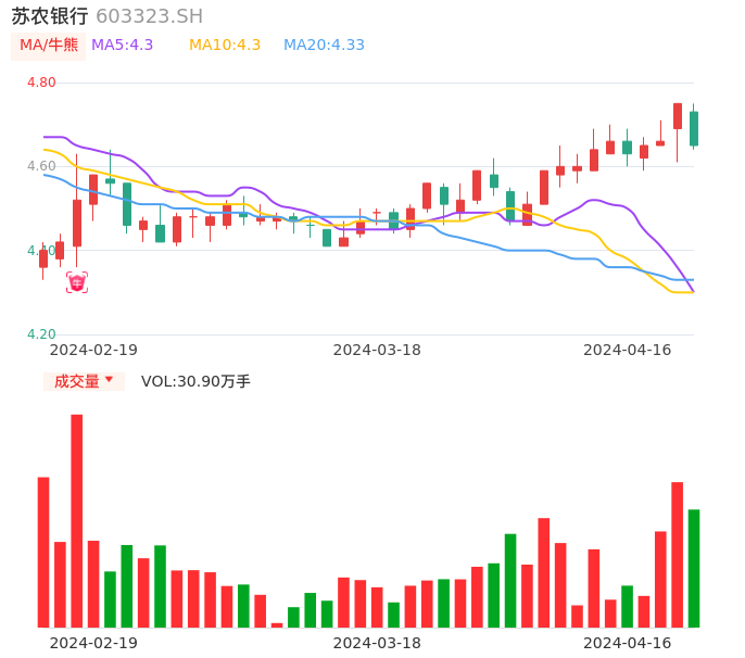 04月16日,苏农银行收报4.65,股价涨幅-2.11%,成交金额1.45亿元,换手率2.00%。
