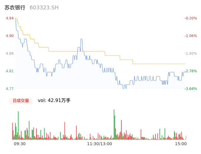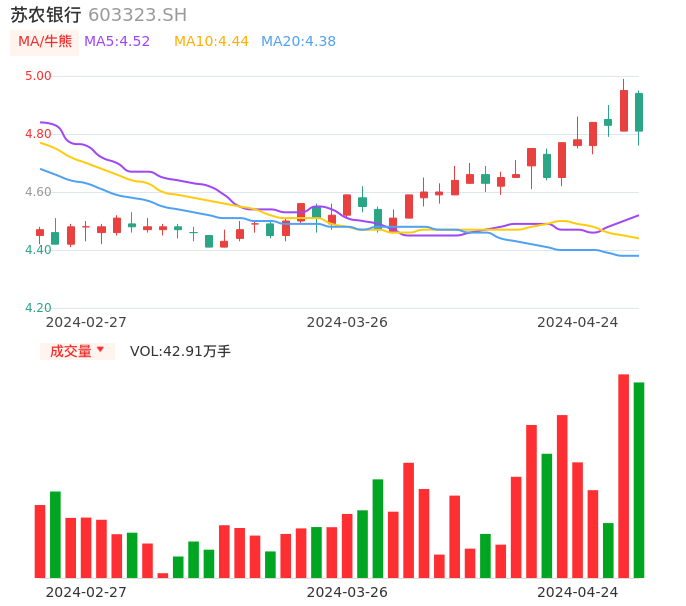 04月24日,苏农银行收报4.81,股价涨幅-2.83%,成交金额2.07亿元,换手率2.78%。