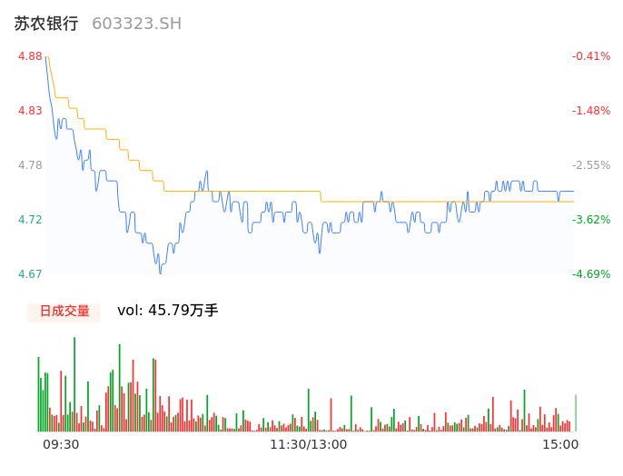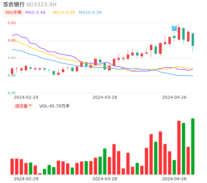 04月26日,苏农银行收报4.74,股价涨幅-3.27%,成交金额2.17亿元,换手率2.97%。