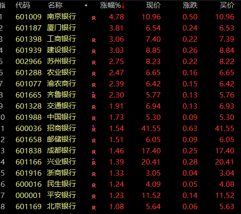 市场热点方面,以银行为首的高股息概念股全线走强,银行板块指数盘中一度逆势放量大涨逾2%,南京银行、厦门银行、工商银行、建设银行等涨幅居前,全部42只银行股仅浦发银行微幅下跌。
