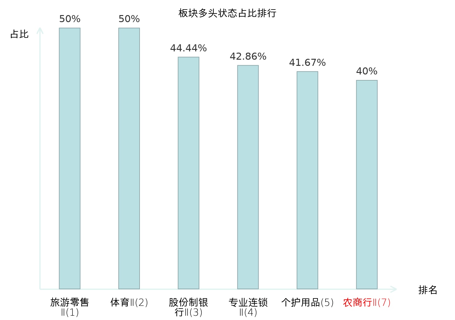 全市场所有行业板块中主力多头状态占比排名中,旅游零售Ⅱ板块位居第一。贵金属板块名次提升最快,较昨日上升83位。