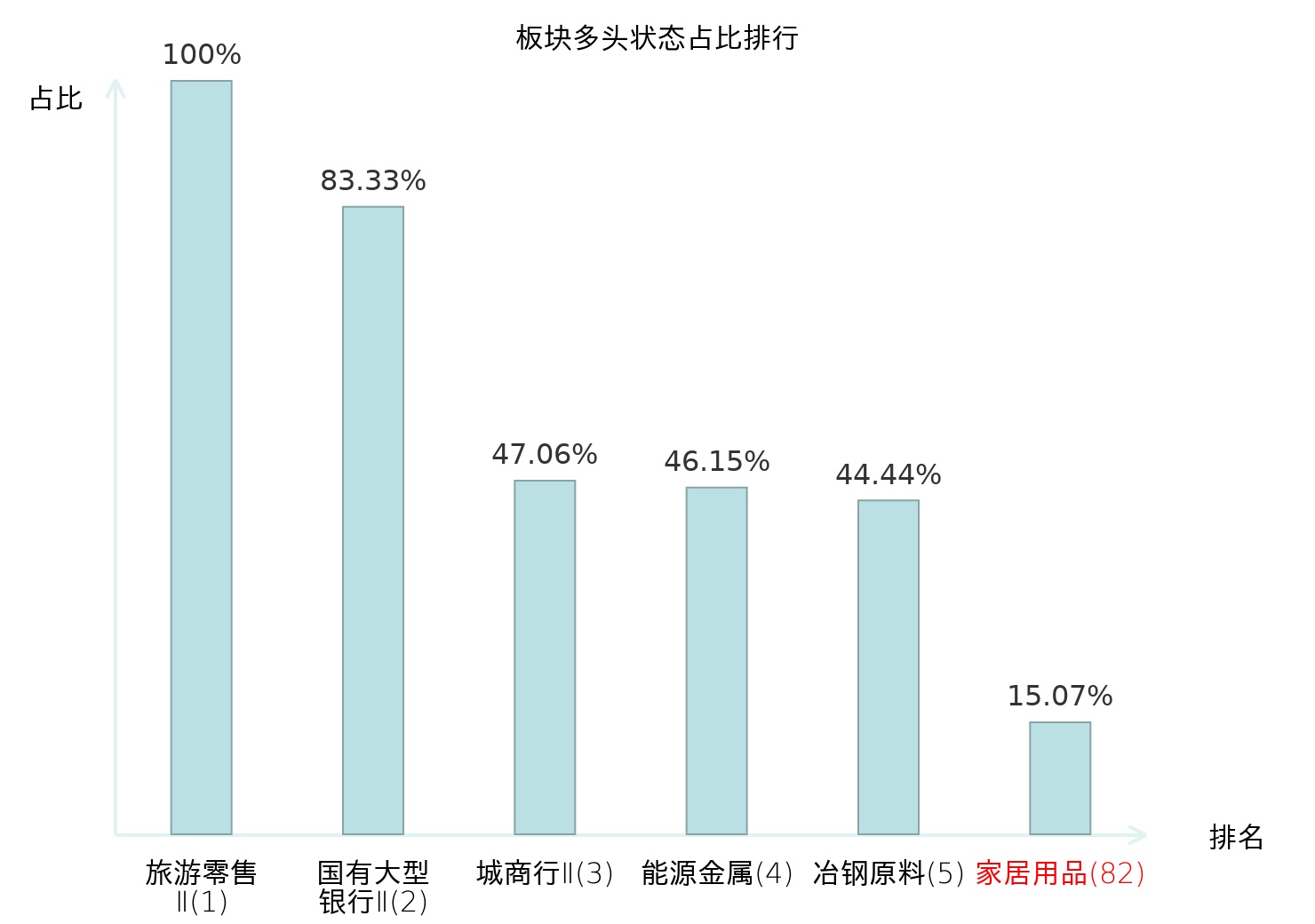 全市场所有行业板块中主力多头状态占比排名中,旅游零售Ⅱ板块位居第一。照明设备Ⅱ板块名次提升最快,较昨日上升59位。