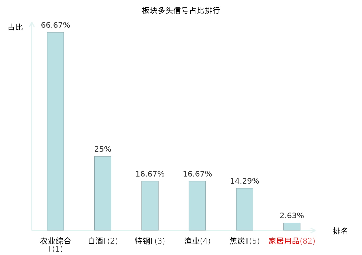 全市场所有行业板块中主力多头信号占比排名中,农业综合Ⅱ板块位居第一。农业综合Ⅱ板块名次提升最快,较昨日上升127位。