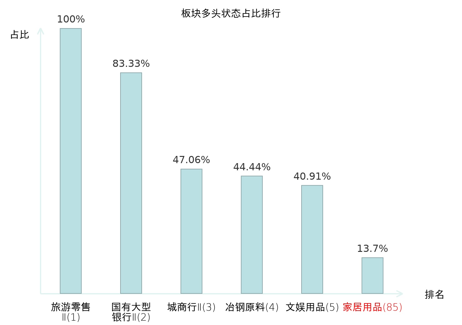 全市场所有行业板块中主力多头状态占比排名中,旅游零售Ⅱ板块位居第一。旅游零售Ⅱ板块名次提升最快,较昨日上升130位。