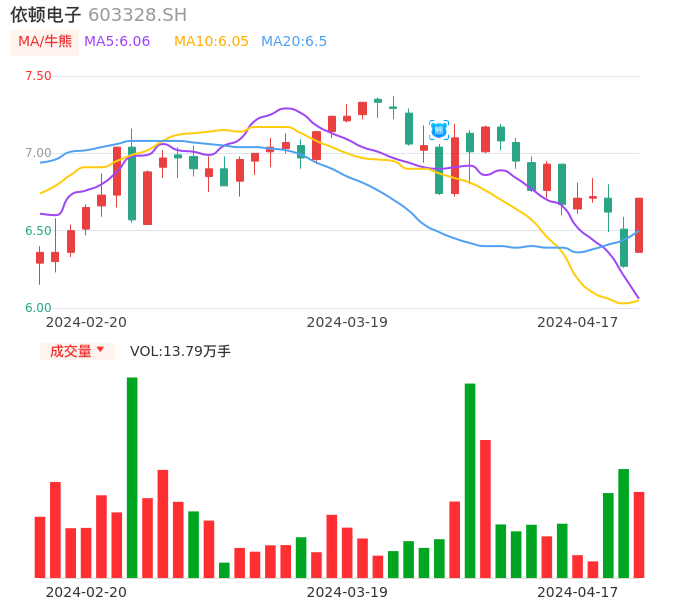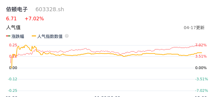 04月17日,依顿电子收报6.71,股价涨幅7.02%,成交金额9075.23万元,换手率1.38%。