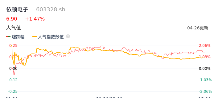 04月26日,依顿电子收报6.90,股价涨幅1.47%,成交金额8287.33万元,换手率1.21%。