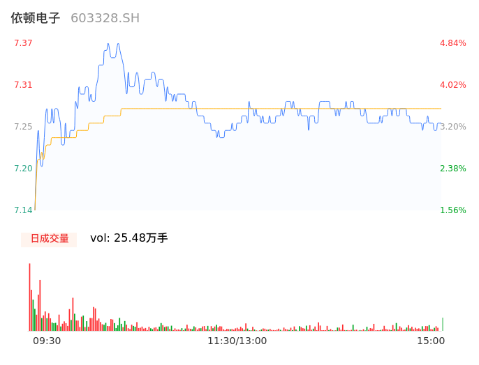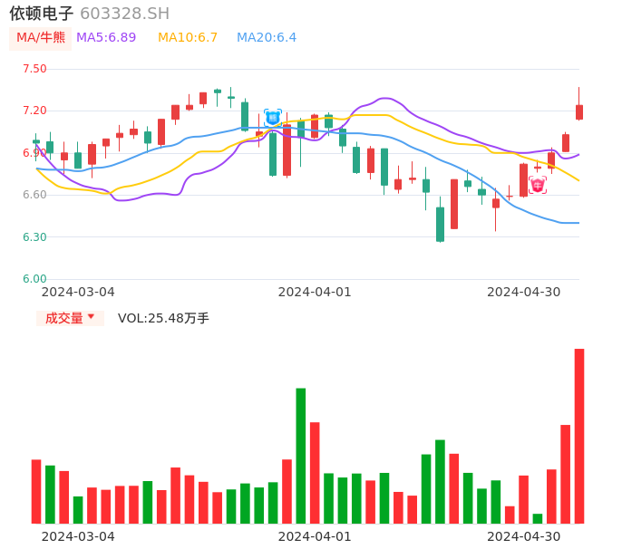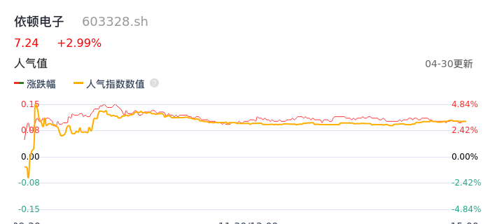 04月30日,依顿电子收报7.24,股价涨幅2.99%,成交金额1.85亿元,换手率2.55%。