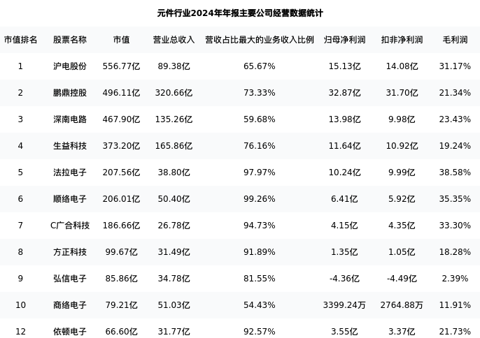 依顿电子最新报告期数据为年报,下表汇总了元件行业内市值靠前的公司年报主要经营数据