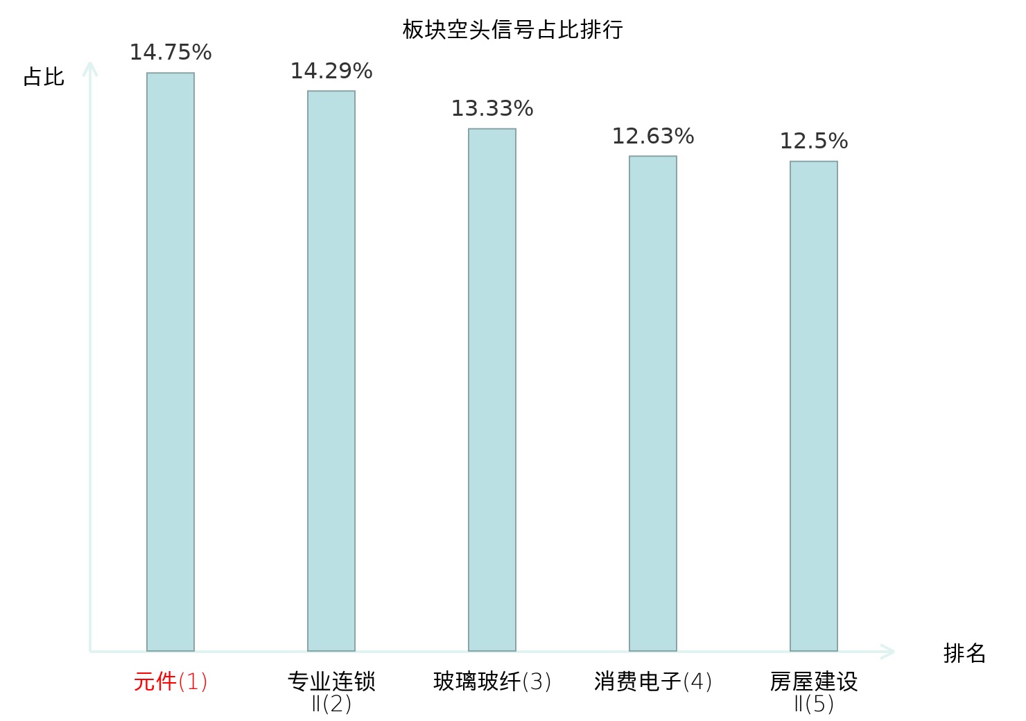全市场所有行业板块中主力空头信号占比排名中,元件板块位居第一。电机Ⅱ板块名次提升最快,较昨日上升111位。