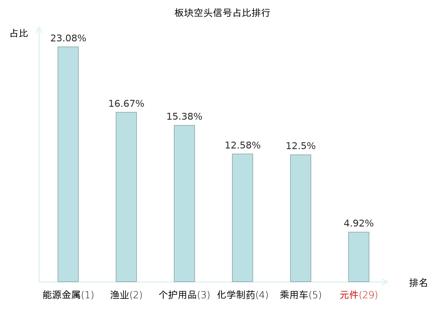 全市场所有行业板块中主力空头信号占比排名中,能源金属板块位居第一。小金属板块名次提升最快,较昨日上升105位。