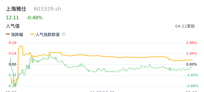 04月22日,上海雅仕收报12.11,股价涨幅-0.49%,成交金额2294.40万元,换手率1.19%。